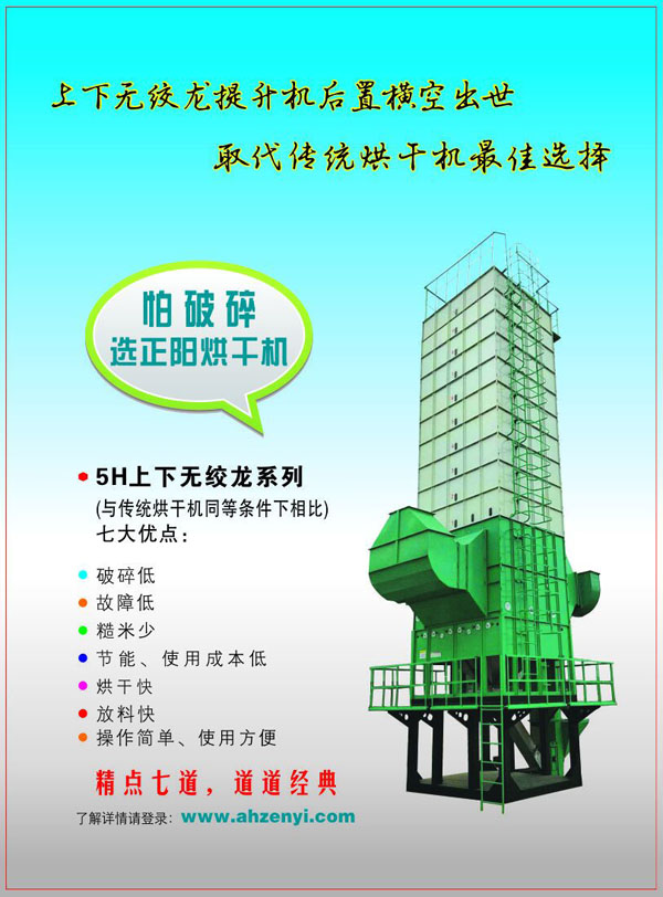 為了更好的滿足市場和客戶的需求,正陽科技推出一款“上下無絞龍系列”谷物烘干機(jī)。糧食破碎霉變猛于虎,正陽烘干機(jī)保護(hù)糧食安全保護(hù)人類健康。正陽烘干機(jī)上下無絞龍系列比傳統(tǒng)烘干機(jī)節(jié)能減耗,是中國糧食烘干機(jī)上下無絞龍?zhí)嵘龣C(jī)后置發(fā)明者與領(lǐng)航者。